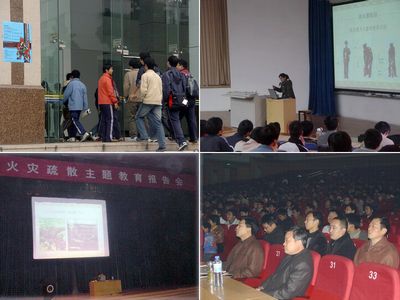 11月19日、20日,2005中国科大火灾疏散主题教育报告会在大礼堂和教学三楼3117教室分别举行。这两场主题教育报告会标志着由学工部处、校团委、保卫处和火灾实验室联合主办的“2005中国科学技术大学火灾疏散演习”系列活动正式拉开帷幕。
