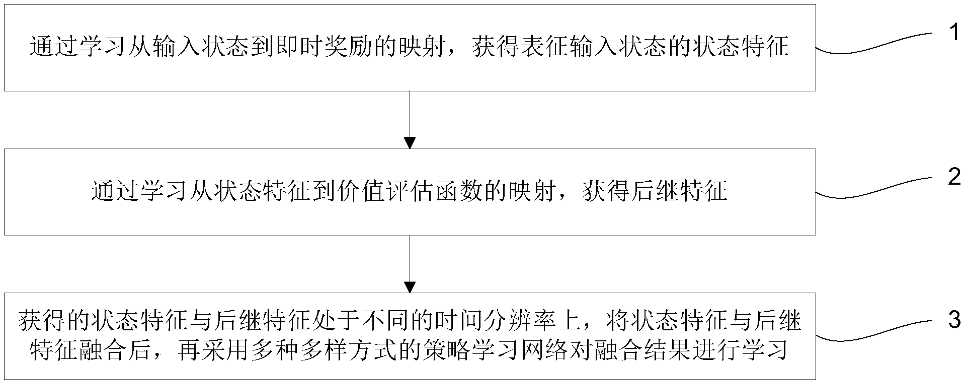 本发明公开了一种状态特征和后继特征的联合策略学习方法,包括:通过学习从输入状态到即时奖励的映射,获得表征输入状态的状态特征;通过学习从状态特征到价值评估函数的映射,获得后继特征;获得的状态特征与后继特征处于不同的时间分辨率上,将状态特征与后继特征融合后,再采用多种多样方式的策略学习网络对融合结果进行学习。与传统的Agent网络相比,本发明更高效的利用了样本信息,与其他算法相比,学习速度明显加快,网络也能更快的收敛且获得较好的学习效果。