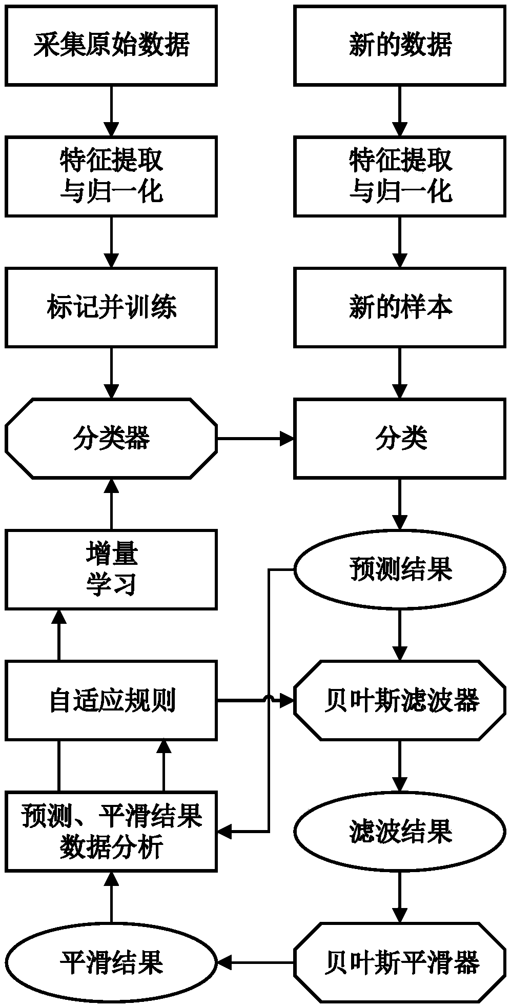 本发明公开了一种基于时空连续性的扩展分类器,包括离线训练、在线分类、在线修正三个部分,其优点在于:1)利用贝叶斯滤波器能够显著提升分类精度;2)利用贝叶斯平滑器能够显著提升历史滤波精度;3)通过对平滑结果和分类结果的在线分析,能够筛选出误分类样例,进而利用这些样例对分类器进行增量训练,能够提升其泛化性能;4)平滑‑分类结果的在线分析还可以用于修正贝叶斯滤波器的参数,从而降低其在状态突变时由于惯性导致的低精度问题。