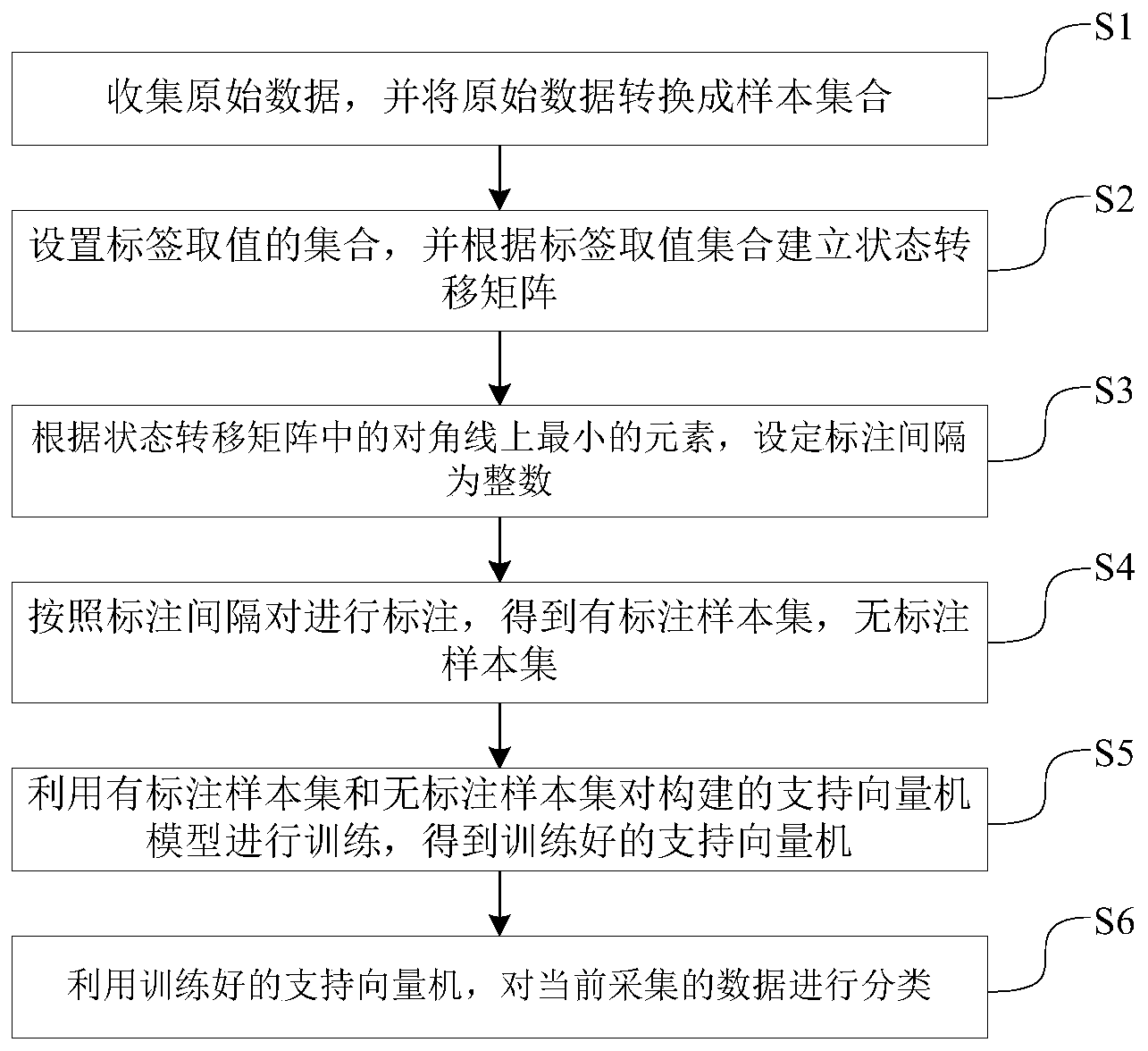 本发明公开了一种半监督图像分类方法及系统,属于计算机技术领域,包括:收集原始数据,并将原始数据转换成样本集合;设L={1,2,…,c,…,l}表示标签取值的集合,c=1,2,…,l,建立状态转移矩阵n=1,2,…,l,Tm,n表示状态m到状态n的转移概率;根据状态转移矩阵中的对角线上最小的元素,设定标注间隔;按照标注间隔对样本进行标注,得到有标注样本集和无标注样本集;利用有标注样本集和无标注样本集对构建的支持向量机模型进行训练,得到训练好的支持向量机。本发明的样本分类很好的反映了数据分类的实际情况,利用分类好的数据对模型进行训练,提高了半监督分类的准确率。