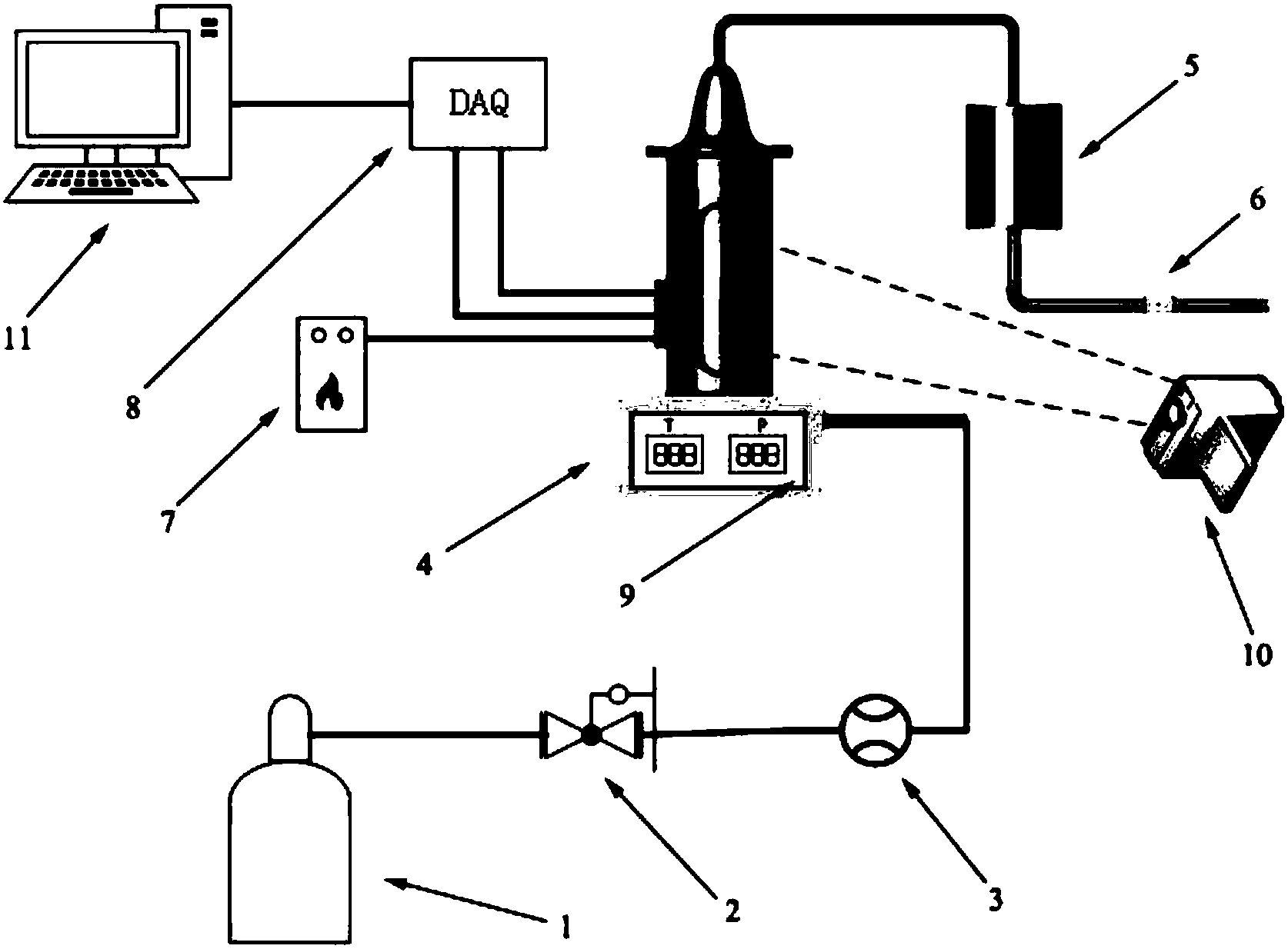 本发明公开了一种带观察窗的固体推进剂高压燃烧特性参数测量设备。该设备包括:高压气瓶组、减压阀、电子流量计、点火器、带观察窗高压燃烧室、缓冲罐、背压阀、高速摄像机、滤光片、数显面板、数据采集模块与计算机。其中带观察窗高压燃烧室又包含壳体、观察窗、温度传感器、压力传感器。与现有技术相比,本发明可同步测量定压下固体推进剂的燃烧速度、燃烧温度、最高燃烧温度等参数的变化,即时获取燃烧火焰形态特征,确认压力对燃烧过程的影响,为固体推进剂的高压燃烧机理研究提供实验支撑。