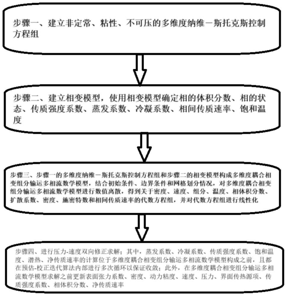 本发明公开了一种耦合相变组分输运的多相流数值求解方法,属于多组分多相流领域,采用相变模型计算多相间组分状态、相间传质速率和相体积分数等,将其耦合到组分输运方程中,对净传质速率、施密特数、多组分扩散效应进一步求解;基于压力‑速度修正的预估‑校正迭代,构建出一个双向耦合、高度协同的求解算法。本发明能够处理温度‑密度‑传质速率‑压力‑速度难耦合难收敛以及界面捕捉不准确问题,实现非定常、粘性、不可压、多维度的非均质和均质多相流计算。对研究能源系统的高效化、集成化及安全性等领域具有重要的工程价值和科学意义。本发明能够模拟复杂的场景,具有高度灵活性、可扩展性及易收敛性,实现更精确的模拟。