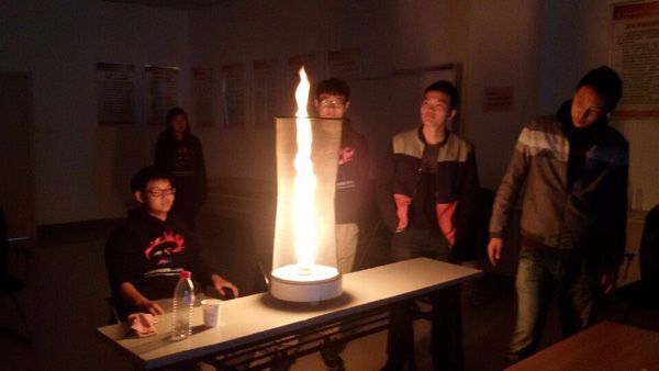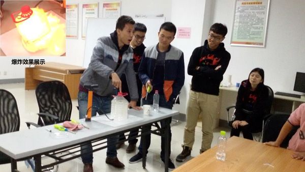 当然,火除了在人类的进化以及生活中起到重要作用,它还给人们带来了很多灾难。首先通过一个圣诞树的燃烧在一分钟之内将房间吞噬来体现火灾发展之迅速,危害之大。火灾和爆炸是孪生兄弟,紧接着通过郑源同学的粉尘爆炸实验展示了火的危害。除了粉尘爆炸,还有巴锐同学的常见易燃品的燃烧来提醒大家对常见易燃品提高警惕。