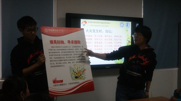 了解到火的危害之后,自然要介绍火的防治。通过科普中心准备的火灾救援逃生技巧展示板,主持人金沙向大家介绍了小朋友们遇到火灾该怎么办。