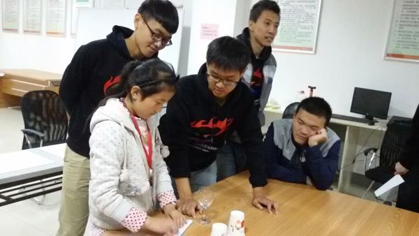 首先展示的是火之美。通过向大家展示自然界和实验室中火千变万化的形态,勾起大家对火的兴趣。通过图片展示之后,要进行试验环节。为了让大家都动脑动手,在进行演示实验之前还有开放性问题在等待着大家。第一道题目是如何用一张纸托住一个高脚杯。大家七嘴八舌,不过都没想到好办法。沉思片刻之后,一个小女孩要进行尝试。