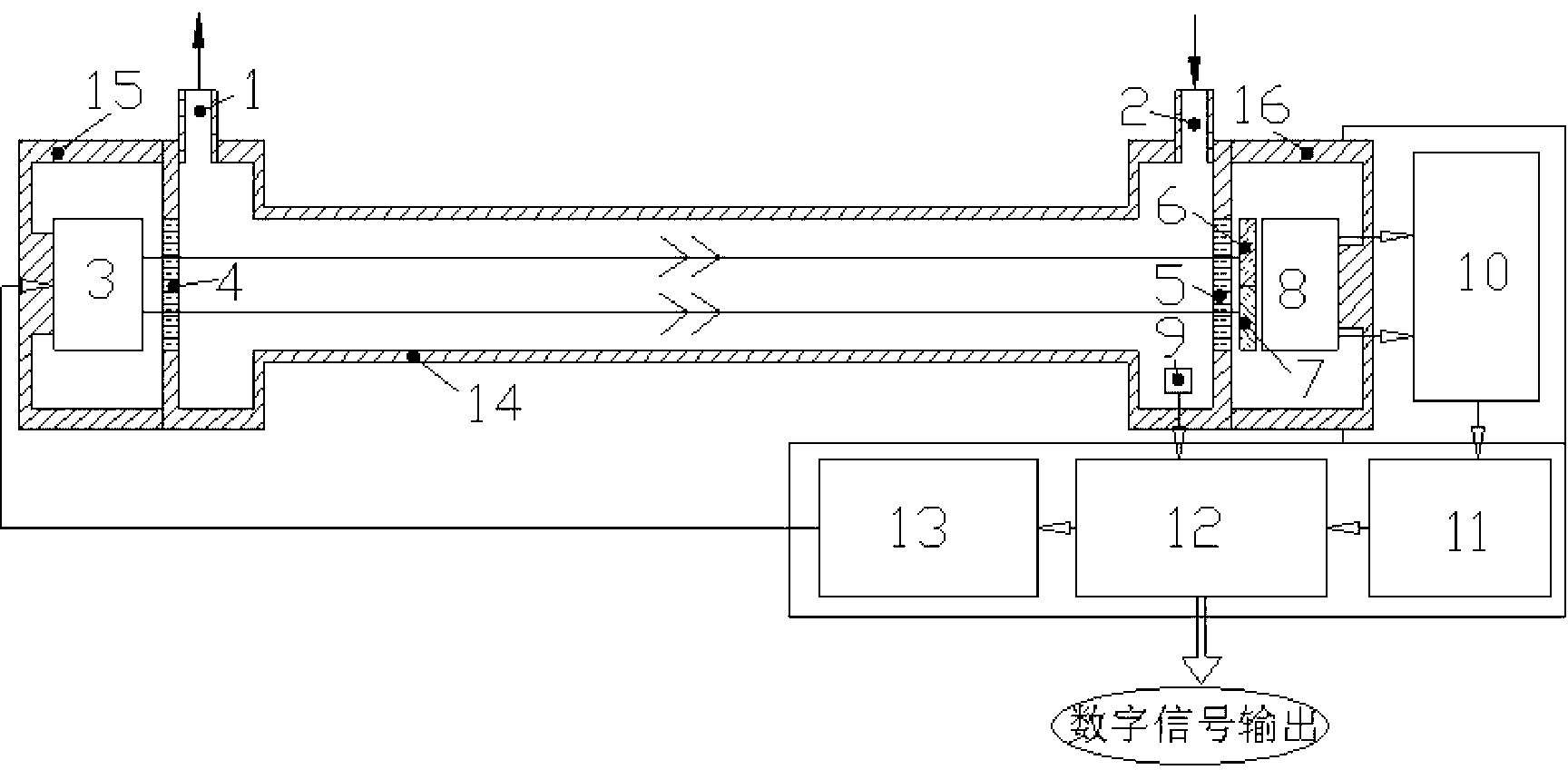 本发明提供一种吸入式SF6气体泄漏监测装置及方法,该装置包括出气口(1)、进气口(2)、红外光源(3)、窗口片一(4)、窗口片二(5)、参比滤光片(6)、测量滤光片(7)、双通道红外探测器(8)、温度探测器(9)、信号调理模块(10)、A/D转换模块(11)、数据处理模块(12)、光源驱动模块(13)、装置本体(14)、端盖一(15)和端盖二(16)。本发明带有数字输出、温度补偿功能、简单可靠、灵敏度高的吸入式SF6气体泄漏监测方法及装置。此方法和装置能对SF6泄漏进行定量监测并对外输出高精度SF6泄漏浓度值,具有监测精度高、稳定可靠、结构紧凑、体积小巧等优点。