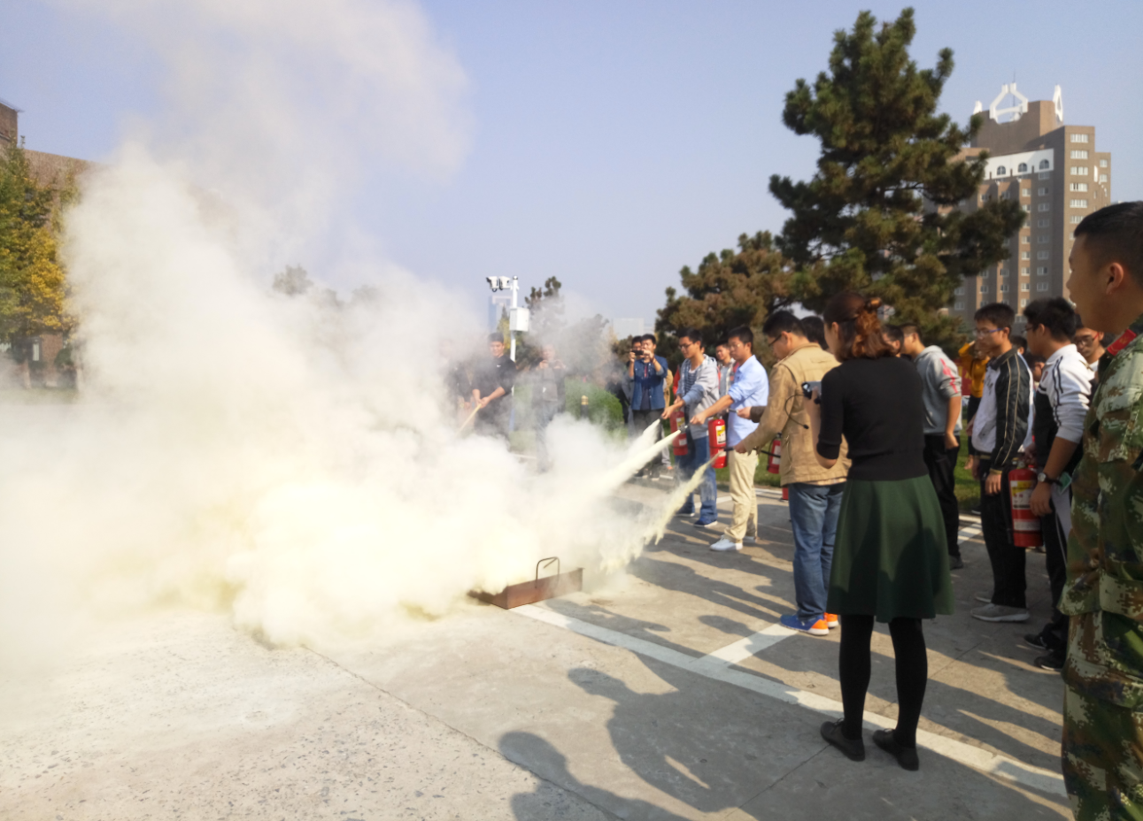 为了让师生们对初期火灾的扑救有更直观的认识,消防官兵在讲解完灭火器的使用方法和注意事项后,现场演示了如何使用干粉灭火器进行灭火,然后由火灾研会组织师生操作灭火器扑灭油池火。在消防官兵的指导下,由大家轮流使用灭火器对着火的油盘进行灭火演练,大家的参与度都很高涨。