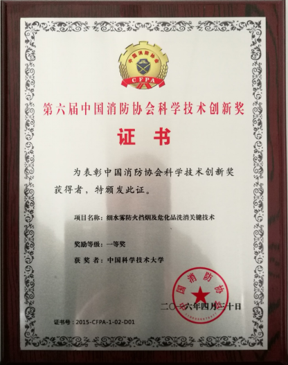 中国消防协会科学技术创新奖是经国家科技部批准设立的中国消防科技领域最高级别的奖项,主要面向中国消防行业科技型企业和科研机构,注重技术创新与科技成果推广应用。我实验室清洁高效灭火研究团队在10多年来从事细水雾灭火技术研究的基础上(相关成果曾荣获2010年度安徽省科学技术奖一等奖),提出了基于多组分细水雾洗消危化品和通过细水雾幕防火挡烟的新思路,并发明了系列安全高效型多组分细水雾洗消添加剂和细水雾幕发生技术,相关成果在海南卫星发射基地、长庆油田、陕西北元化工园区、安徽省广电新中心等重要场所得到成功应用。