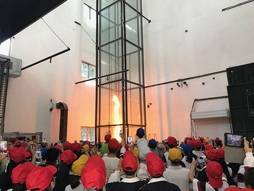 早上9点,火灾科学国家重点实验室大楼门前的参观者就排起了长队,只为一睹“火旋风”的风采。在众多开放参观项目中,最吸引眼球的莫过于火旋风实验台了。在工作人员的讲解和操作下,演示实验开始了。只见油盘中心燃料先是被引燃产生小火苗,之后迅速升腾绽放,逐渐发展为高达十几米的旋转火焰,火越烧越旺,舞动的螺旋状火焰一时引来参观者不由自主地发出惊叹声。随着燃料即将耗尽,绚丽细长的火苗瞬间熄灭,大家纷纷拿出手机拍摄记录下这美妙的瞬间。许多家长表示,这是小朋友们第一次见到如此规模的火焰,近距离感受火旋风的神奇与威力,相信讲解员们普及的火灾安全知识同样能给他们留下深刻的印象。