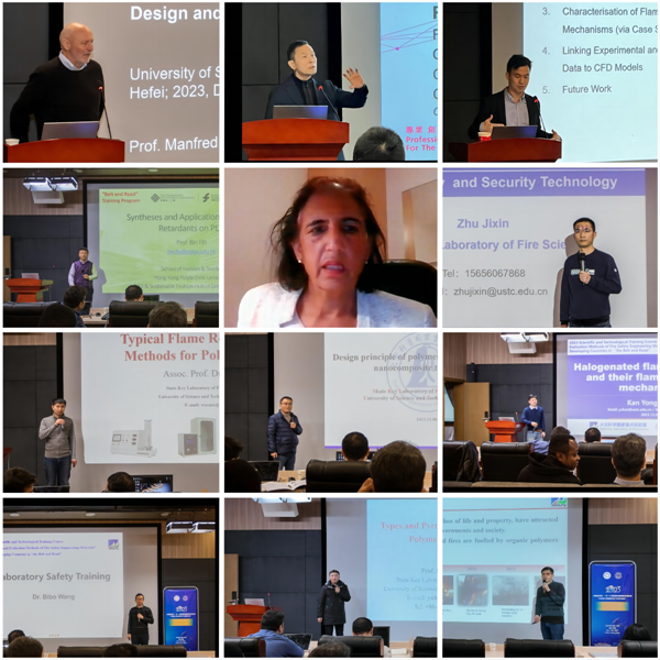 本次培训于12月5日举行开班仪式,中国科学技术大学国际合作与交流部王晨副部长和火灾科学国家重点实验室刘乃安主任分别代表学校、实验室为培训班开班仪式致辞。本次培训班负责人、火灾科学国家重点实验室胡源研究员主持了开幕式。培训内容分四部分:一是技术方法理论基础,讲授火安全工程材料设计的基本原理及在锂电池、纤维增强复合材料、生物基可降解高分子材料中的应用;二是火安全工程材料表征技术,现场了解常用仪器及其操作流程;三是观摩学习,考察参观火灾科学国家重点实验室、中国科学技术大学先进技术研究院、清华大学合肥公共安全研究院、会通新材料股份有限公司等火安全工程材料相关科研机构和企业研究领域及设备情况;四是头脑风暴,每位学员结合自身实际,探讨在火安全工程材料领域合作研究和未来展望。