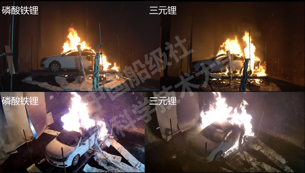 两台同型号不同电池类型新能源实验车辆燃烧过程