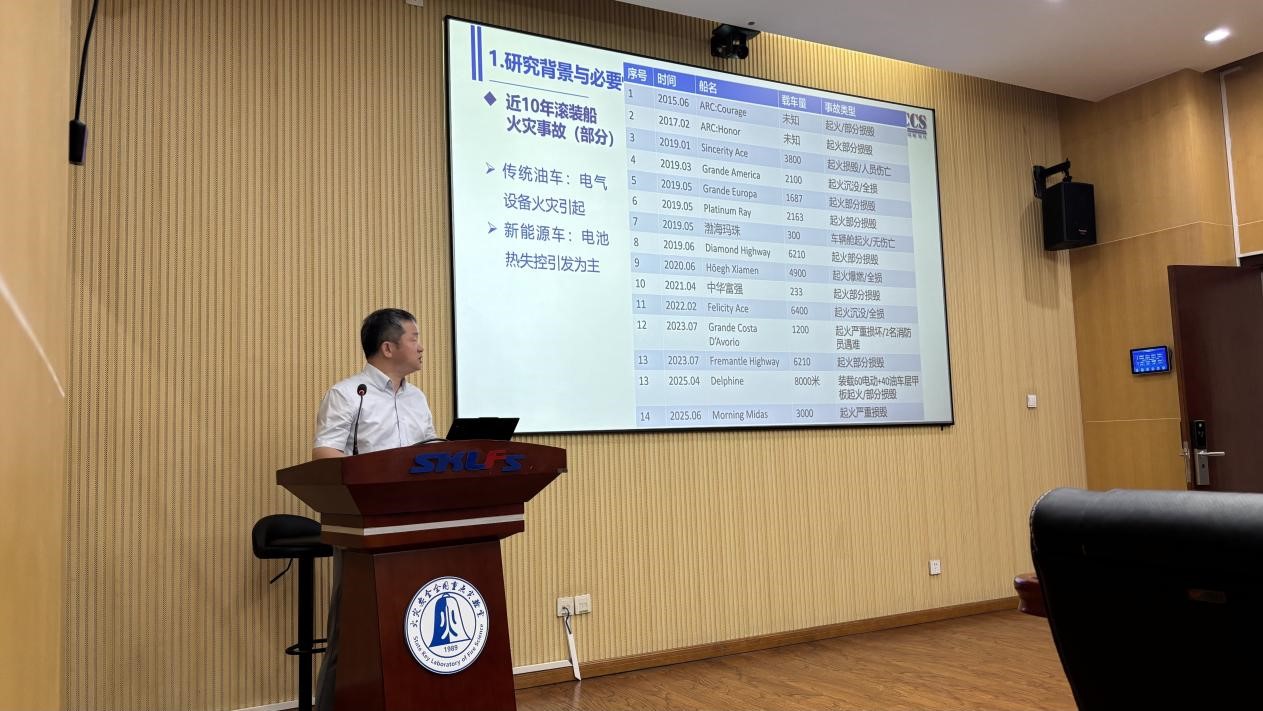 会上,中国船级社蔡忠云博士介绍了项目背景与总体情况,邹凯予特任副研究员报告了项目实施进展。与会各方围绕船舶载运新能源汽车火灾安全主题,就整车燃烧实验结果、监测预警、风险防控、技术标准、应急处置等核心议题进行了深入交流和探讨。