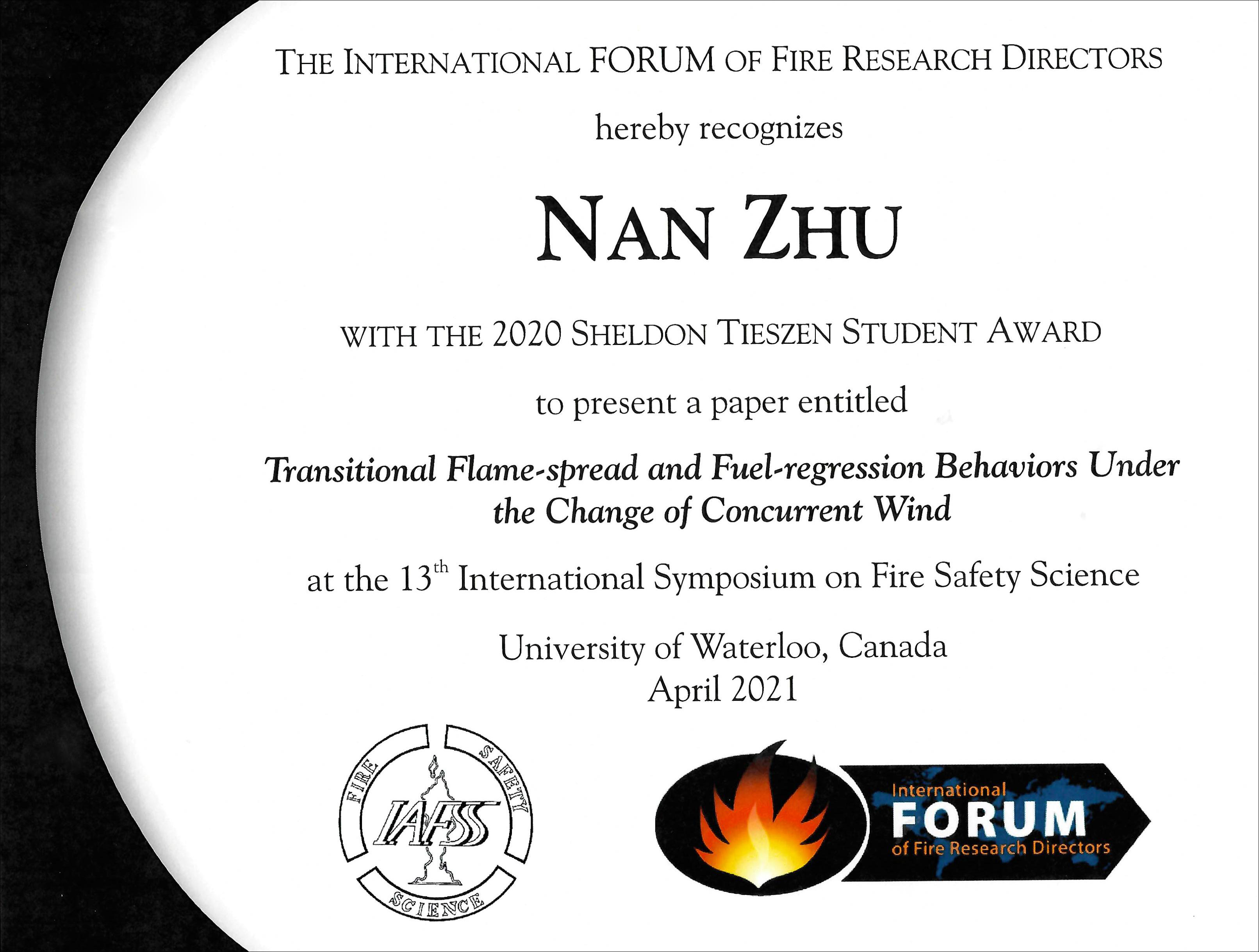 我实验室博士生朱楠获第13届国际火灾安全科学大会Sheldon Tiesze...