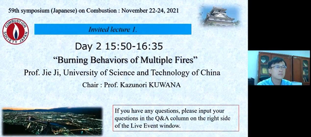 2021年11月22日至24日,第59届日本燃烧学年会[The 59th Symposium (Japanese) on Combustion]以线上方式举行。纪杰研究员受邀作题为Burning Behaviors of Multiple Fires(多火燃烧行为)的大会邀请报告。报告分为研究背景、研究现状、应用与未来挑战三个部分...