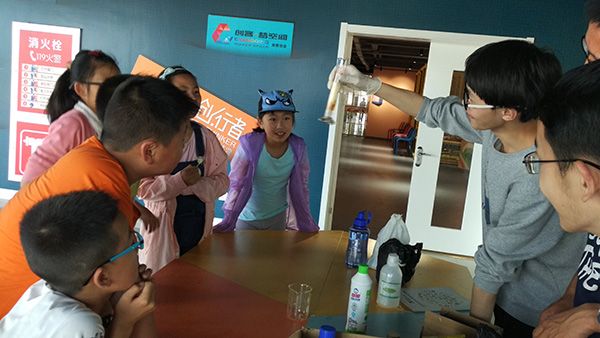 淝南家园素来注重科普教育。团员们今天科普的地点就是淝南家园特地修建的一个小型科技馆内。在这里,团员们也被这些豪华的设备所吸引,不过,他们还是没有忘记这次来的目的,当即凭借自己在学校中获得的知识为在场的几位小朋友讲解了一些其中的原理。不过接下来才是团员们的正业,他们精心准备了“大象牙膏”、“斯特林发动机”、“茶水变墨汁”、“自动浇花器”、“认识酸碱性”五个小实验和小制作。