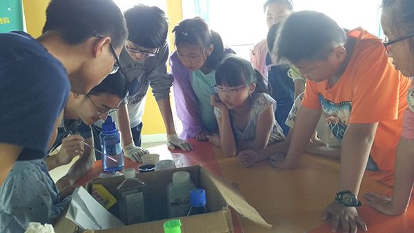 小朋友们围在一起看着团员们的表演惊叹不已,虽然还不是很明白团员们口中所说的原理,但是都表现出了对科学的极大兴趣。虽然中途出现了一些小插曲,一个粗心的小朋友打翻了正在燃烧的酒精灯,但是团员们及时用湿布盖上灭火同时也为小朋友们展示了灭火的正确方式。
