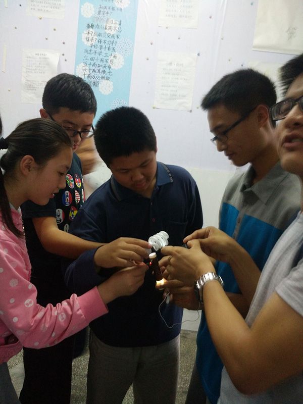 学生们亲手感受灯泡感应发光的实验(一)