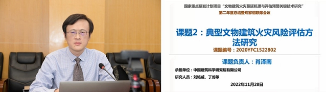 2022年11月28日,由我校牵头承担的国家重点研发计划“文物建筑火灾蔓延机理与评估预警关键技术研究”项目第二年度工作总结暨专家组联席会议以线上线下相结合的方式顺利召开。项目咨询专家组组长清华大学范维澄院士,专家组成员中国石油大学(北京)张来斌院士、清华大学袁宏永教授、中国科学院上海高等研究院杨晓飞正高级工程师、中国建筑科学研究院李引擎研究员、南京工业大学蒋军成教授、山西省消防救援总队朱江高工、故宫博物院张克贵研究馆员、北京建筑设计研究院有限公司孙成群教授级高工,科技部21世纪中心社会处项目主管彭雪婷、国家文物局督察司安全监管二处处长郑丽娜、国家文物局科技教育司科技处处长钱坤、中国科学院前沿科学与教育局天文力学处处长孔明辉、布达拉宫管理处副处长贡嘎、黟县文化旅游体育局副主任李文龙、我校科研部副部长薛永泉教授、中国建筑科学研究院副总工程师邱仓虎等主管部门和项目承担单位领导、项目组成员和应用示范单位代表,共计90余人参加会议。会议由项目负责人、火灾科学国家重点实验室副主任纪杰研究员主持。