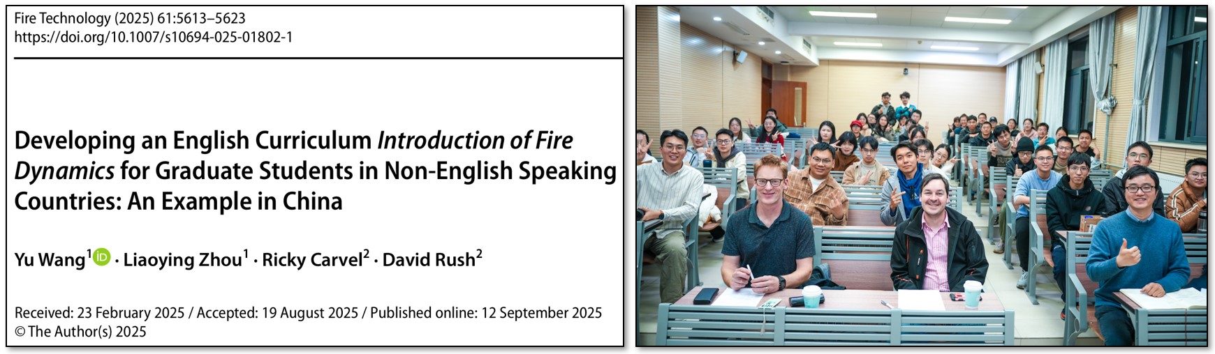 课程介绍论文:Wang, Y., Zhou, L., Carvel, R. et al. Developing an English Curriculum Introduction of Fire Dynamics for Graduate Students in Non-English Speaking Countries: An Example in China. Fire Technol 61, 5613–5623 (2025). https://doi.org/10.1007/s10694-025-01802-1