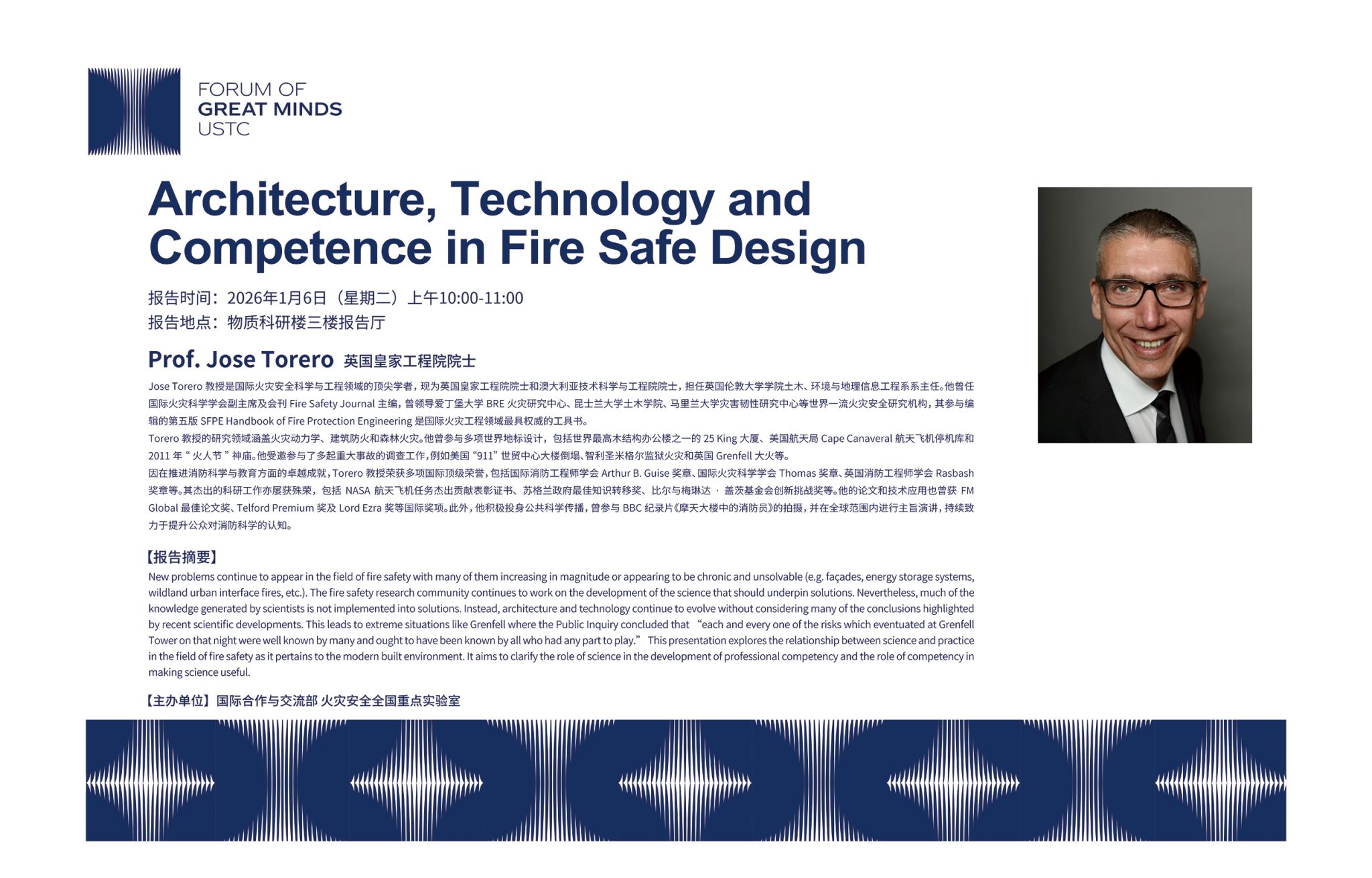 应学校邀请,英国皇家工程院院士、澳大利亚技术科学与工程院院士Jose Torero教授将于2026年1月6日来校作“Architecture, Technology and Competence in Fire Safe Design”学术报告。